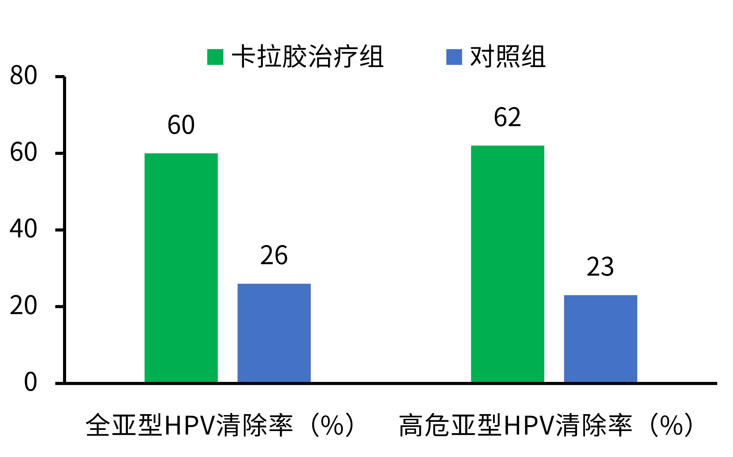 治疗组患者每日使用卡拉胶凝胶30天后阴道镜检查宫颈病变,再隔日一次持续治疗45天,卡拉胶凝胶治疗后高危型HPV转阴率是对照组的2.69倍。
