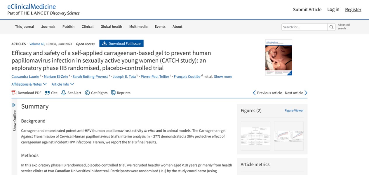 8. Laurie C, El-Zein M, Botting-Provost S, et al. Efficacy and safety of a self-applied carrageenan-based gel to prevent human papillomavirus infection in sexually active young women (CATCH study): an exploratory phase IIB randomised, placebo-controlled trial. EClinicalMedicine. 2023;60:102038. doi:10.1016/j.eclinm.2023.102038