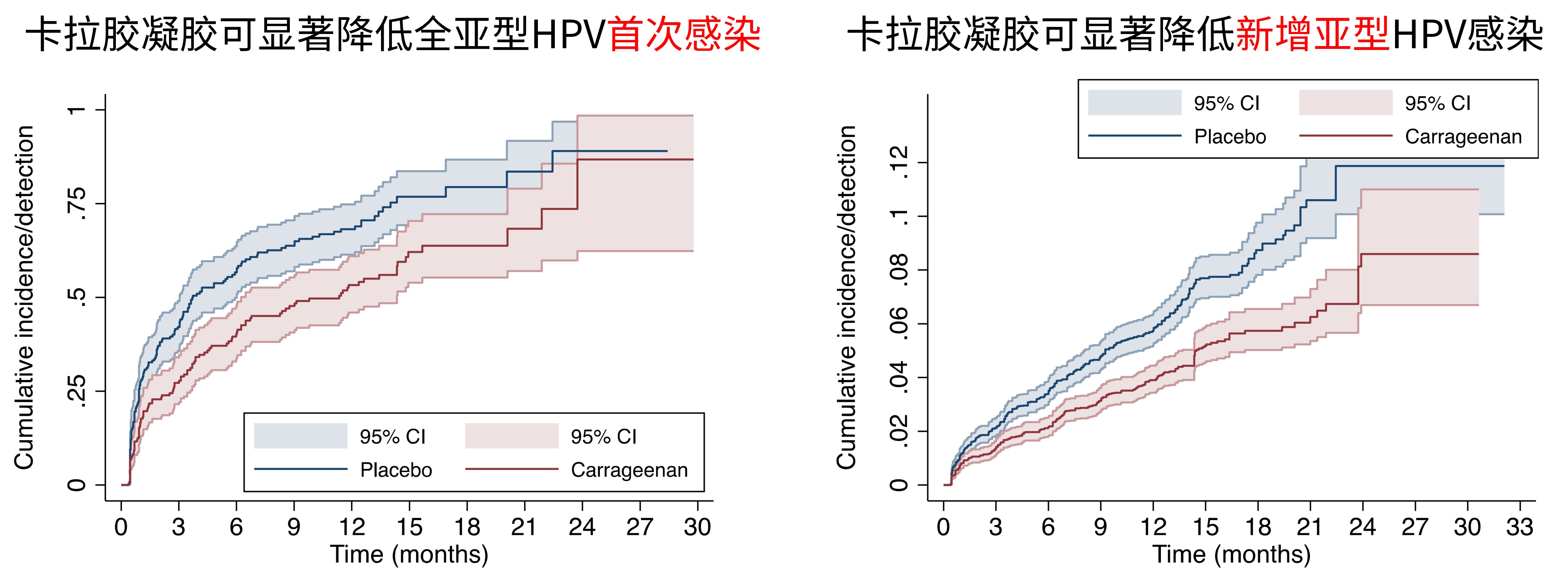 875名女性在性生活前使用卡拉胶凝胶,843名女性使用安慰剂凝胶。6个月后检测HPV感染发现:规范使用卡拉胶凝胶组的HPV感染率比安慰剂对照组下降了38%(与加拿大临床试验高度吻合),而且坚持正确的使用卡拉胶凝胶,可大大提高HPV感染的保护效果。