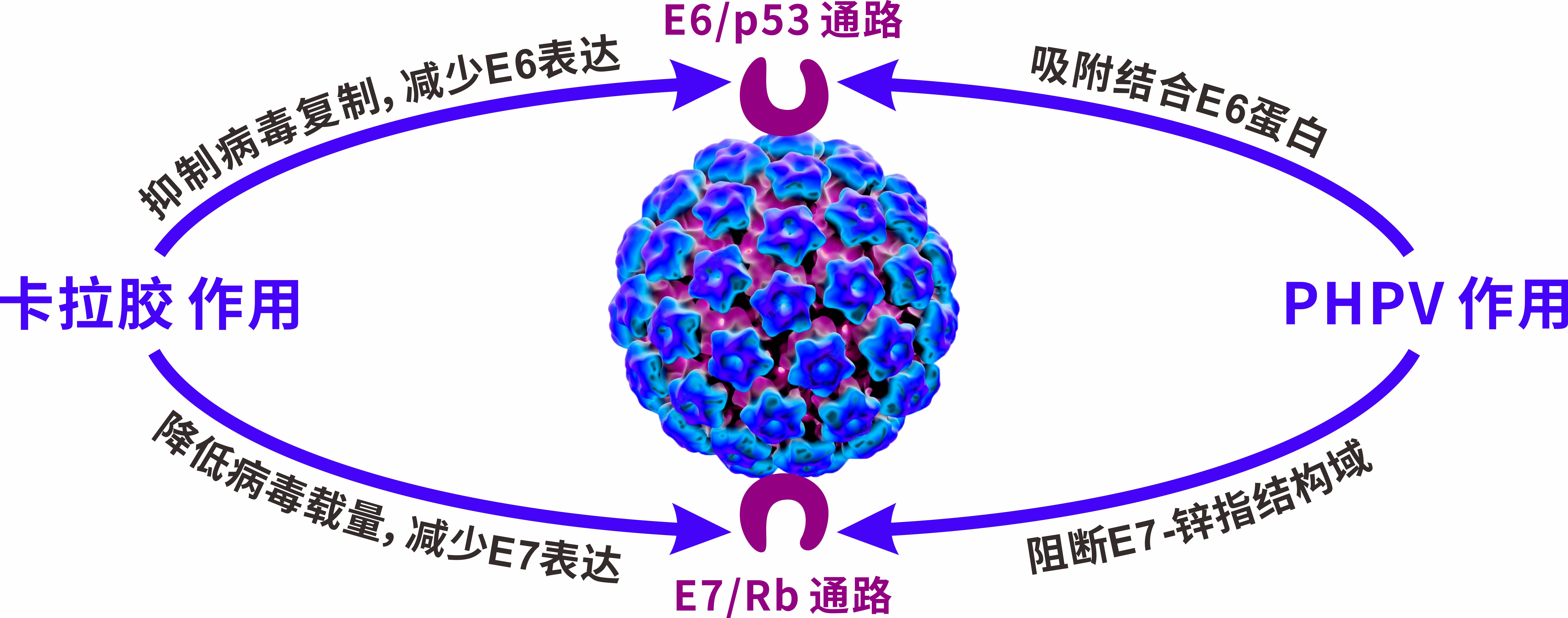 PHPV融合因子与卡拉胶协同抑制病毒,间接遏制E6E7表达,阻断细胞转化通路。