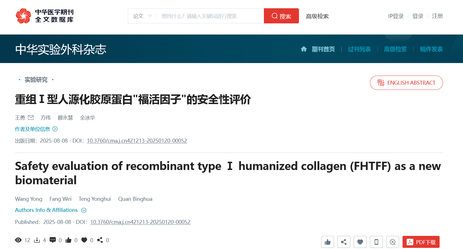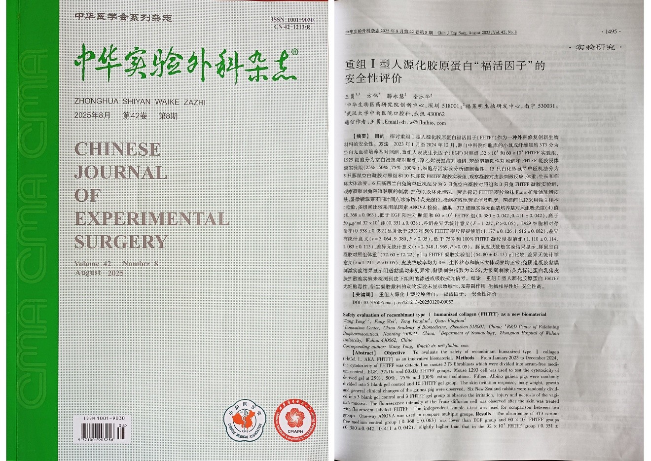 近日,福莱明生物原研首创的重组I型人源化胶原蛋白“福活因子”(FHTFF)安全性评价研究成果,在北大核心期刊《中华实验外科杂志》2025年第42卷第8期正式刊发表(https://rs.yiigle.com/cmaid/1572003)。研究结论显示:融合人源I型/III型胶原蛋白特征和功能的重组I型人源化胶原蛋白福活因子(FHTFF)在有效修复皮肤黏膜损伤同时,未观察到细胞抑制、免疫刺激及系统毒性,生物相容性优异,具备临床快速转化应用的安全性基础。