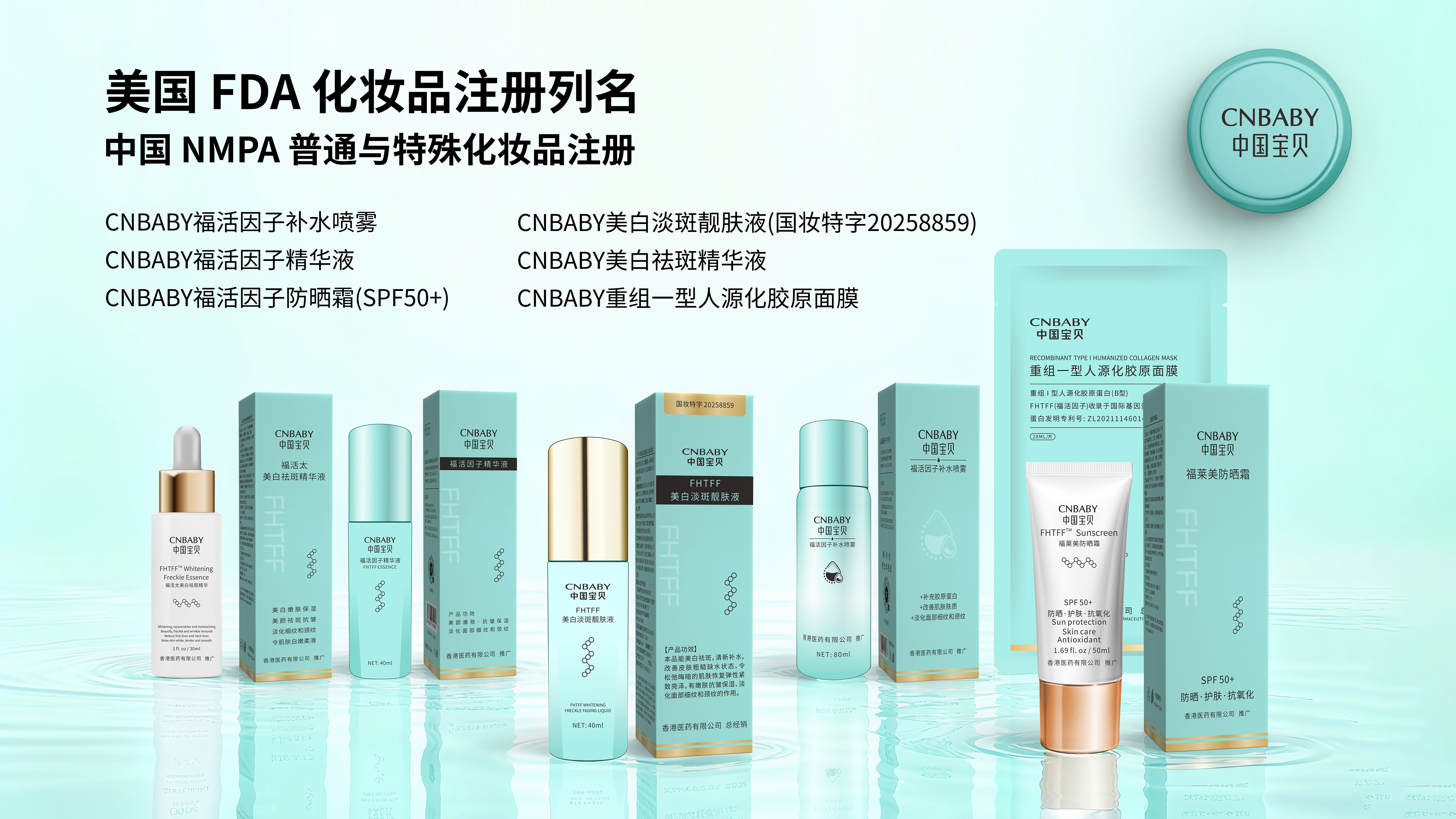 以 “AI + 胶原” 为核心,“中国宝贝 CNBABY” 重新定义 “精准修护” 新赛道。从2024年世界AI应用大会上,CNBABY以一场全球首发仪式向世界递交了一张亮眼的“中国名片”,到2025年国际美容节AI论坛,福莱明生物不仅让国际学术界看到中国生物科技的突破性进展,更让产业界感受到国货美妆的质变升级。基于福活因子FHTFF开发的六款核心功效型化妆品,已成功完成美国FDA工厂注册及产品列名程序。这一成就标志着中国宝贝CNBABY获得了进军全球最大美妆消费市场的权威通行证,更彰显了“中国智造”在生物科技美妆领域的硬核实力。