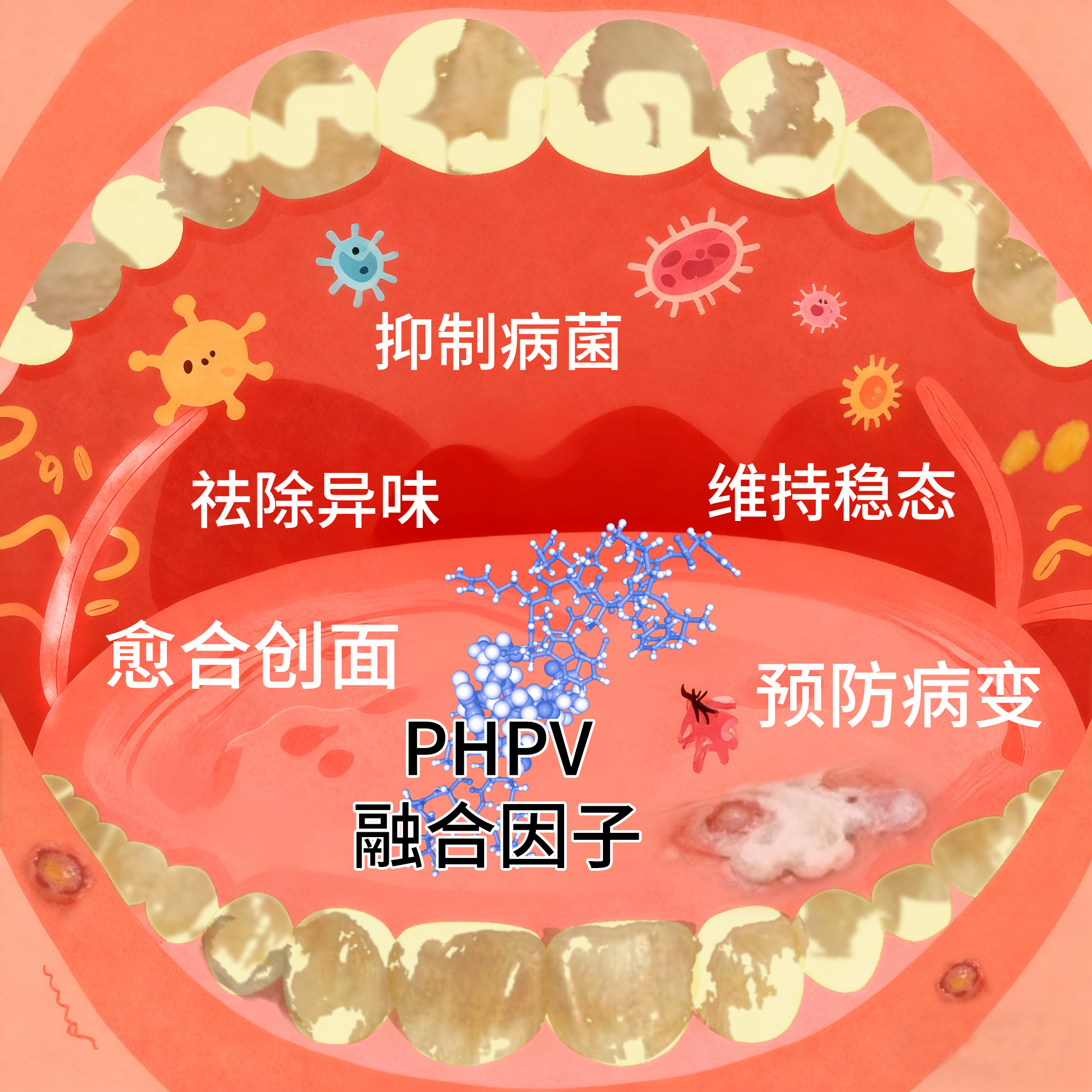 PHPV融合因子抗菌肽段能精准抑制金黄色葡萄球菌、白色念珠菌等常见口腔致病菌,同时对与牙周炎、龋齿密切相关的致病菌同样具有抑制能力。有效控制感染,为黏膜修复扫清障碍,创造一个洁净的愈合环境,